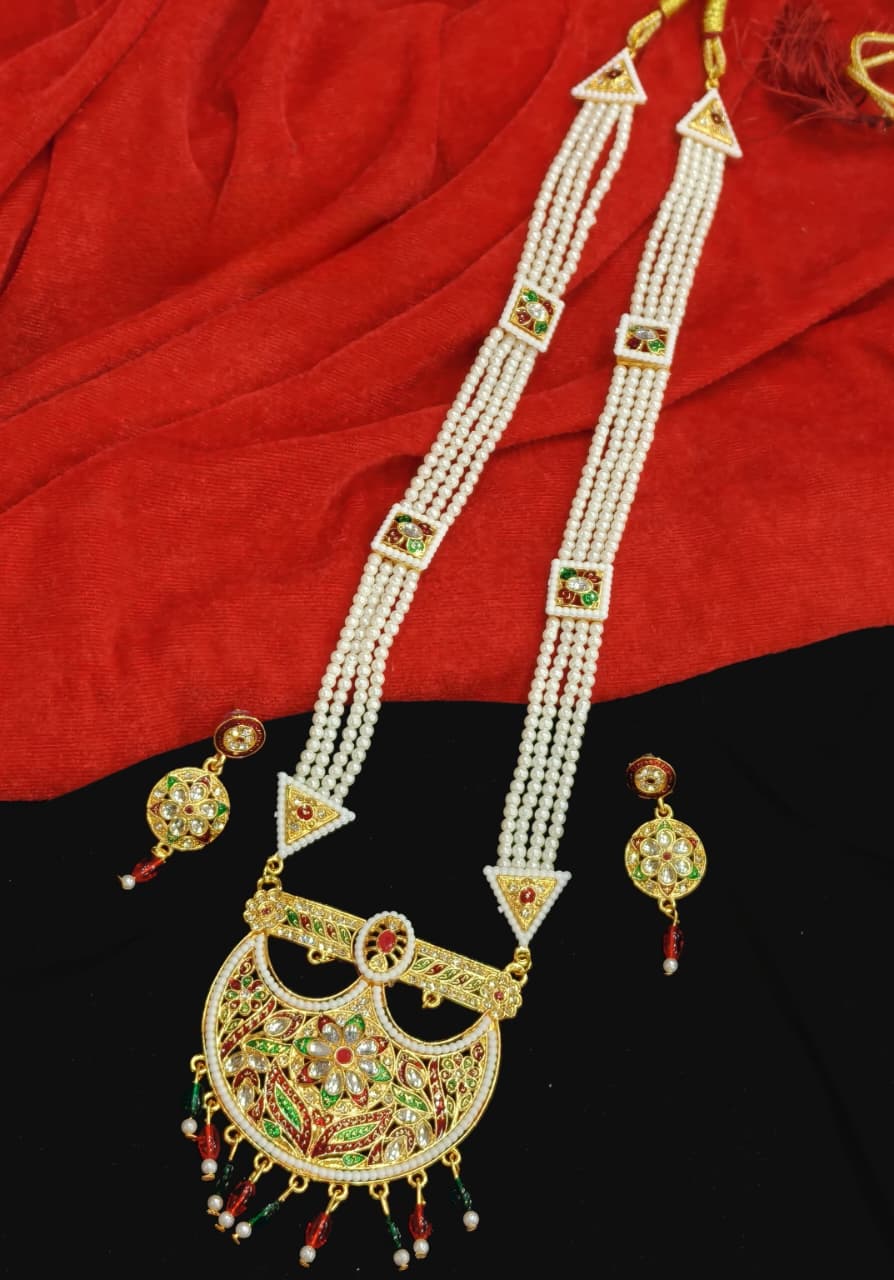 Crafted using premium quality pearls and alloyed metal, this luxurious Rajasthani long necklace set is finished with durable micro polish in artificial golden tone, providing long-lasting shine and superior quality. The beautifully arranged multicolor stones add a vibrant charm to the necklace, while the glowing pearls enhance its royal appeal. The elegant long necklace with pendant design creates a magnificent statement that elevates every ethnic ensemble.