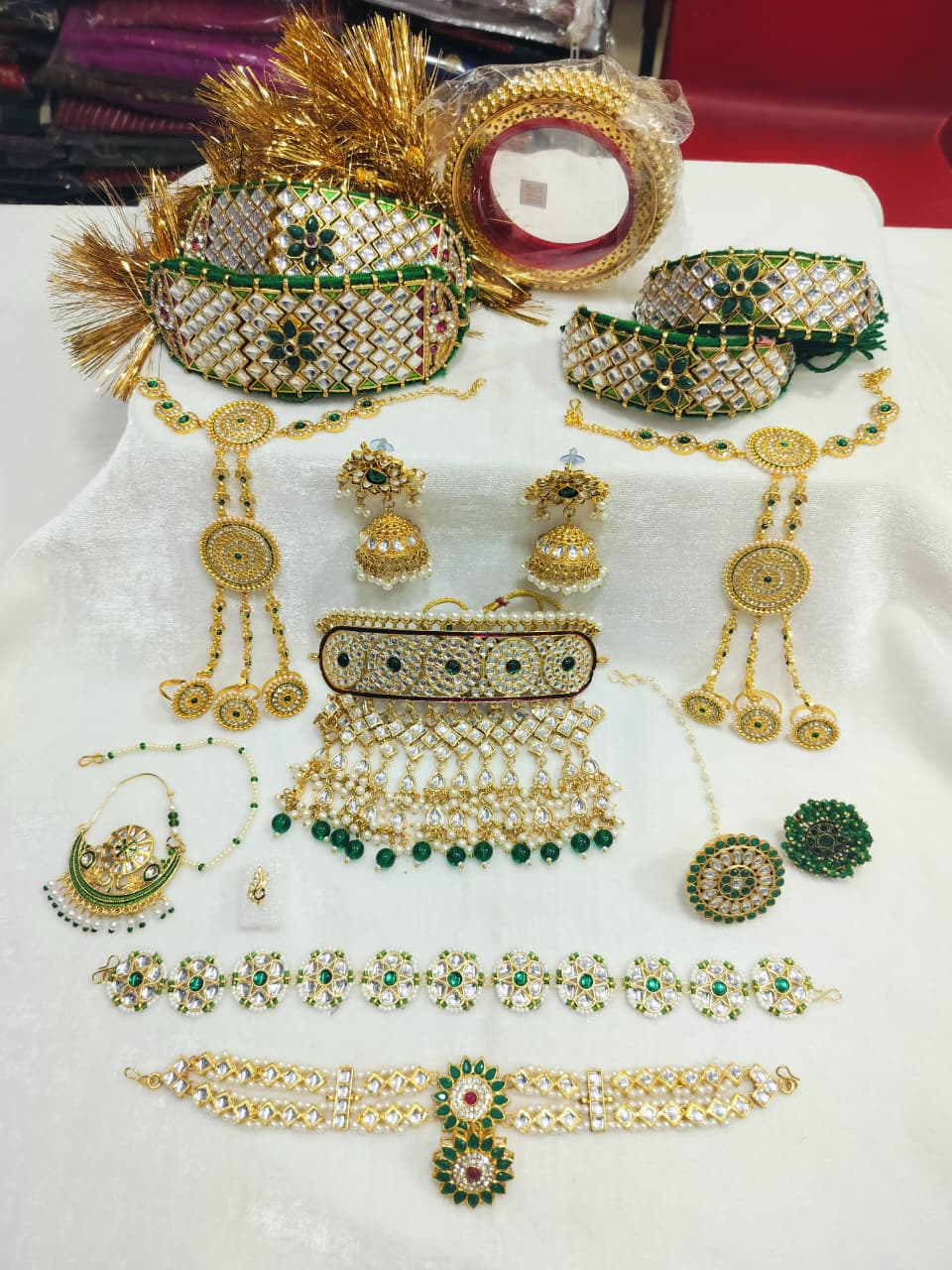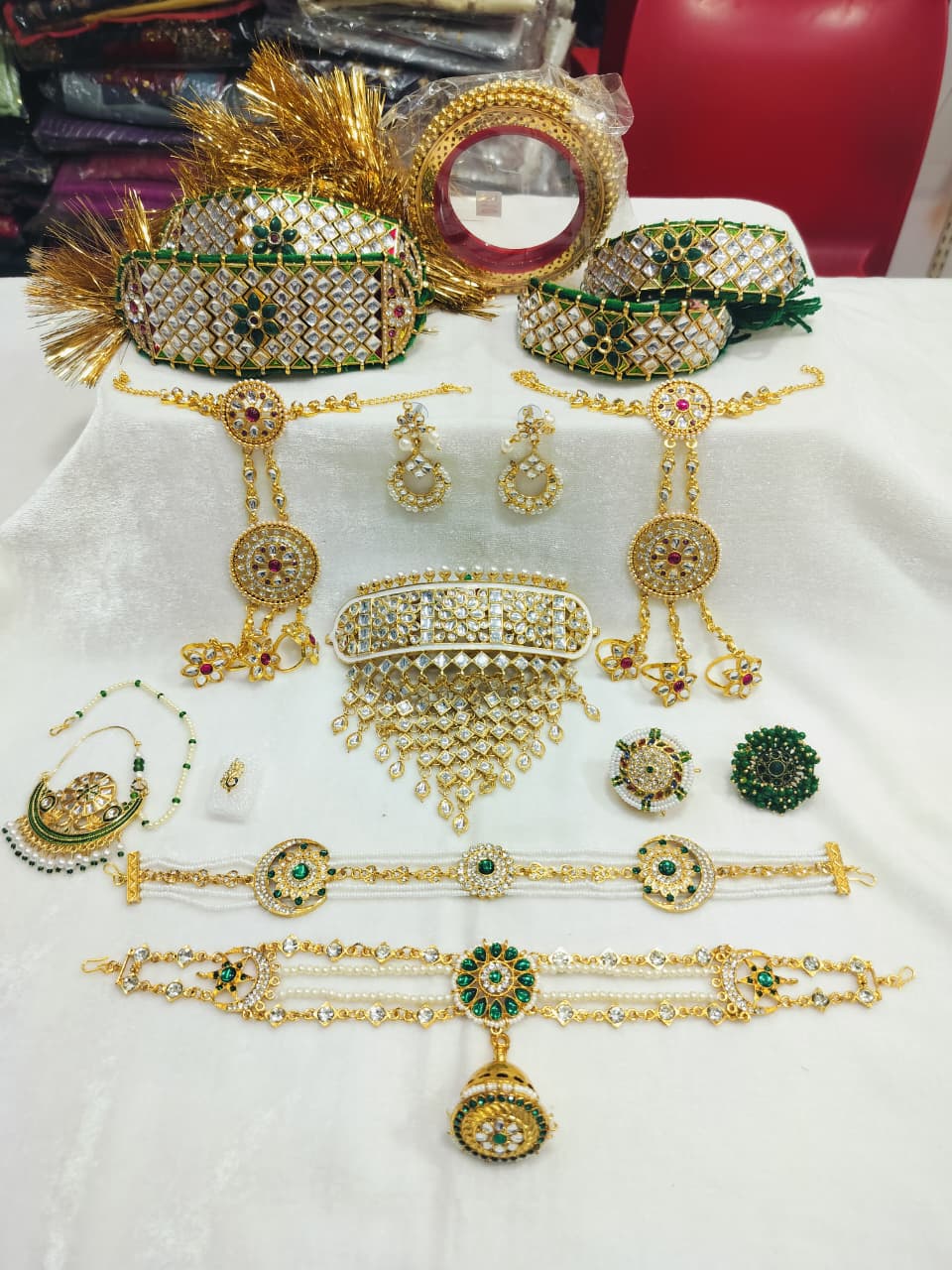 Why settle for less when you can have it all? This combo set includes every essential piece required to create an authentic Rajasthani bridal look. The set comprises a stunning Aad (with matching Earrings) , featuring an exquisite peacock design that rests elegantly on the neckline. It also includes a pair of intricately crafted Bajuband (Armlets) and Punchi / Poochi (Wristlets) to adorn your arms. The regal Mathapatti with Borla adds a divine aura to your forehead, while the Hathpan (Hand jewelry) and Besar ensure your hands look equally resplendent. The set is completed with a traditional Nath (Nose ring) and a matching Ring, making it a comprehensive 9-piece solution for your trousseau.