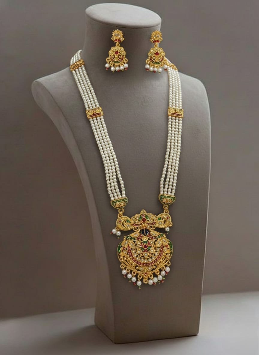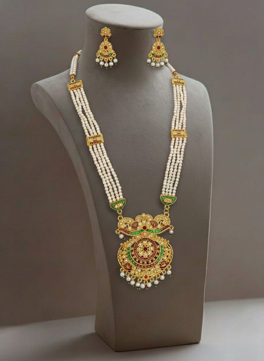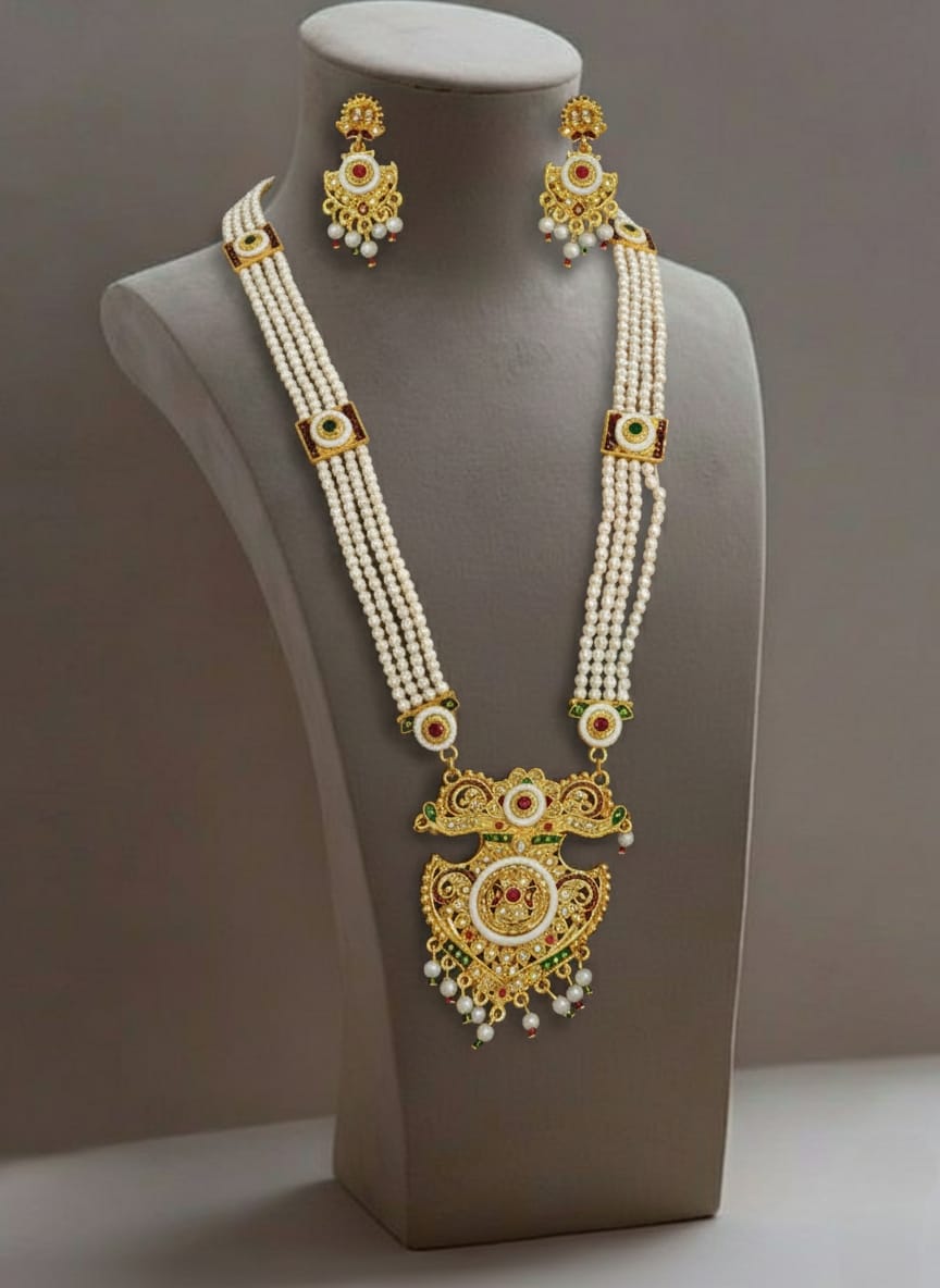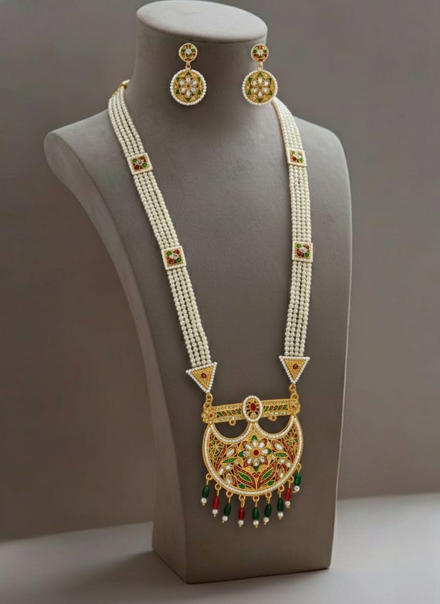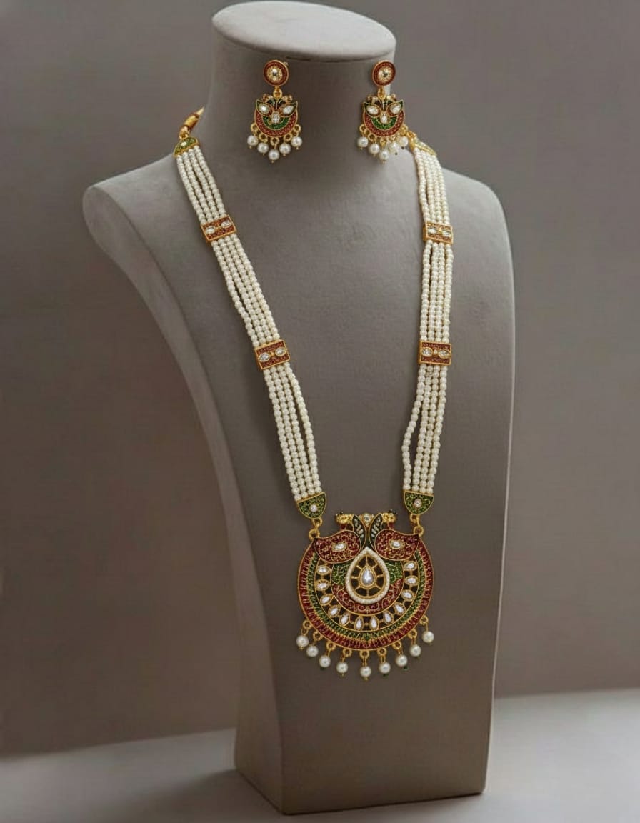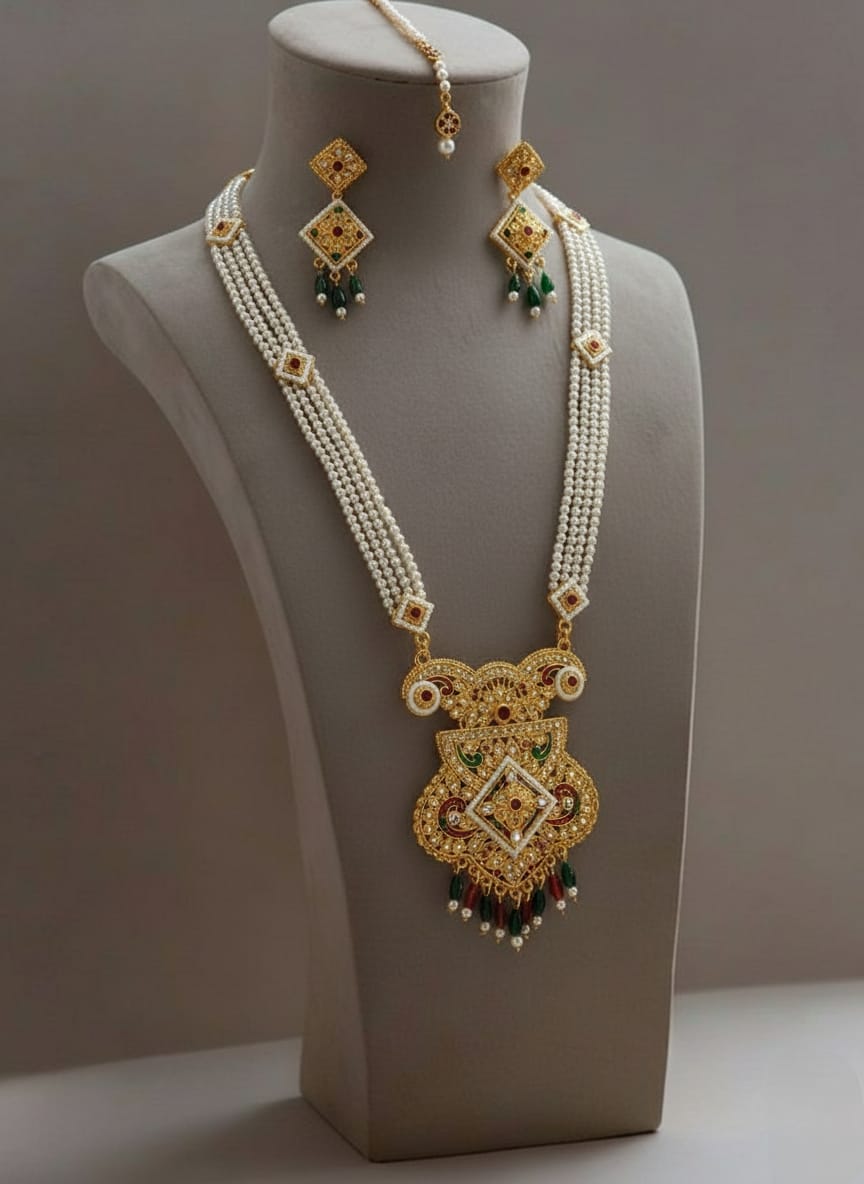 Celebrate the grandeur of royal Rajasthan with the exquisite Rajputi Rani Har with Peacock Shape Pendant, exclusively available at Banadi Store. Inspired by traditional Rajputi heritage, this magnificent Rajasthani long necklace set reflects regal elegance, cultural richness, and timeless beauty — making it a perfect choice for women who cherish authentic ethnic jewelry.