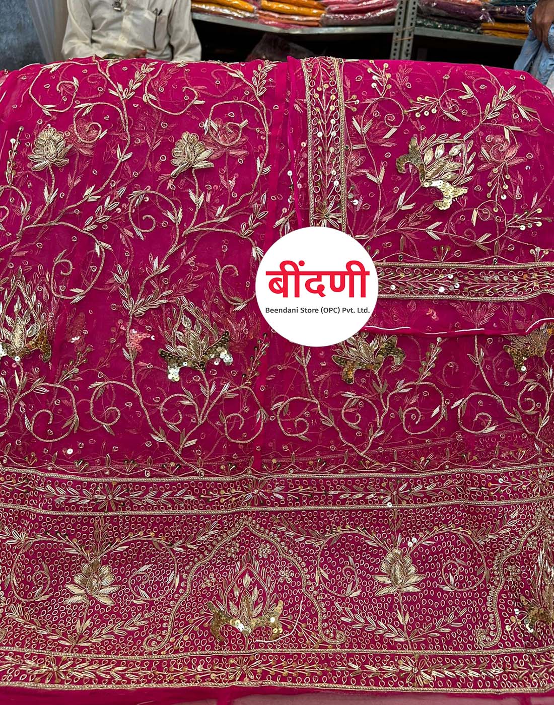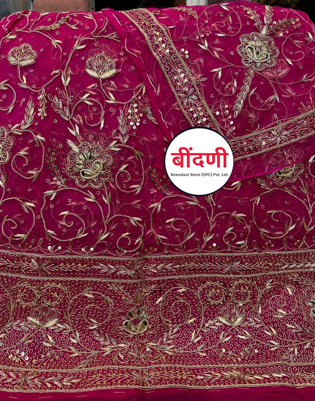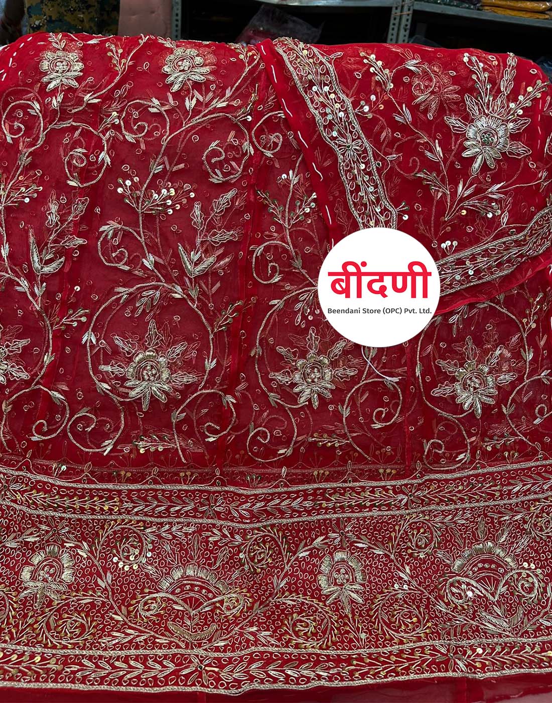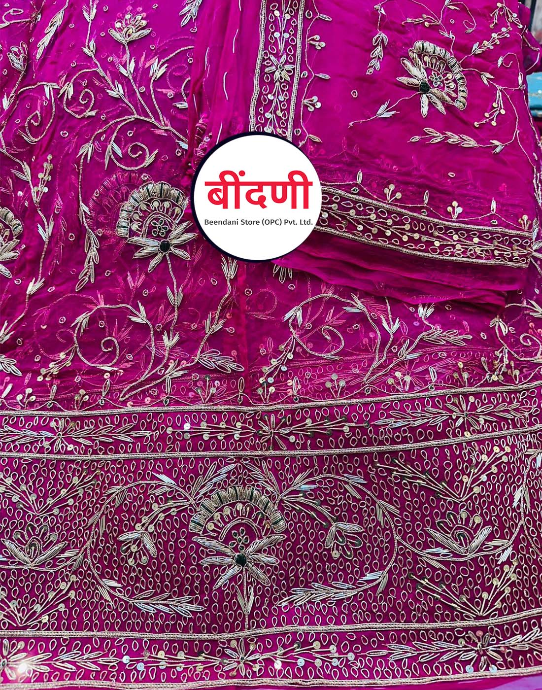 Crafted from premium Thakurji Pure fabric, this Heavy Work Bridal Poshak offers unparalleled comfort and elegance. Thakurji Pure is renowned for its exquisite texture, durability, and the ability to hold heavy embroidery beautifully without compromising on comfort. The fabric drapes gracefully, allowing you to move through all your wedding ceremonies with ease and poise. Its natural sheen provides the perfect canvas for the elaborate Zardozi work, ensuring every metallic thread and bead stands out with clarity and brilliance. The choice of Thakurji Pure fabric reflects a commitment to quality and authenticity that is central to the Rajputi bridal tradition.