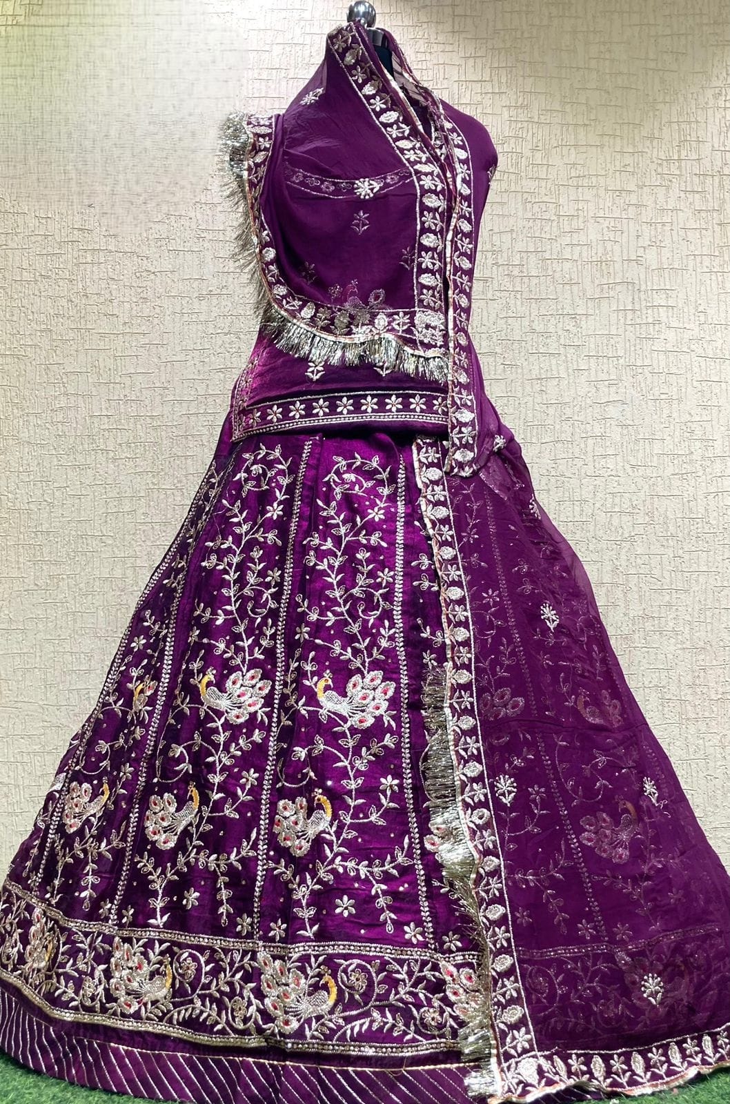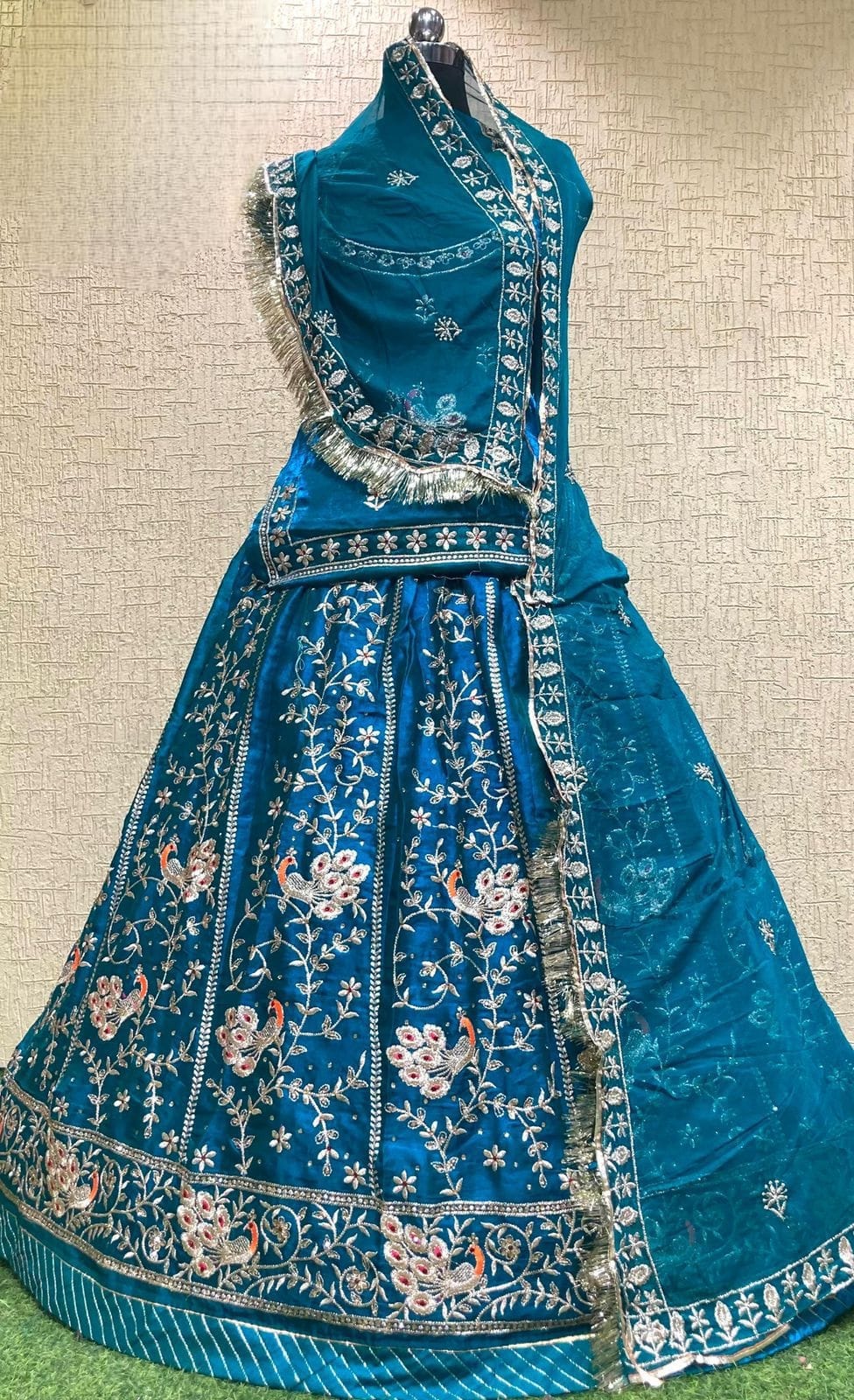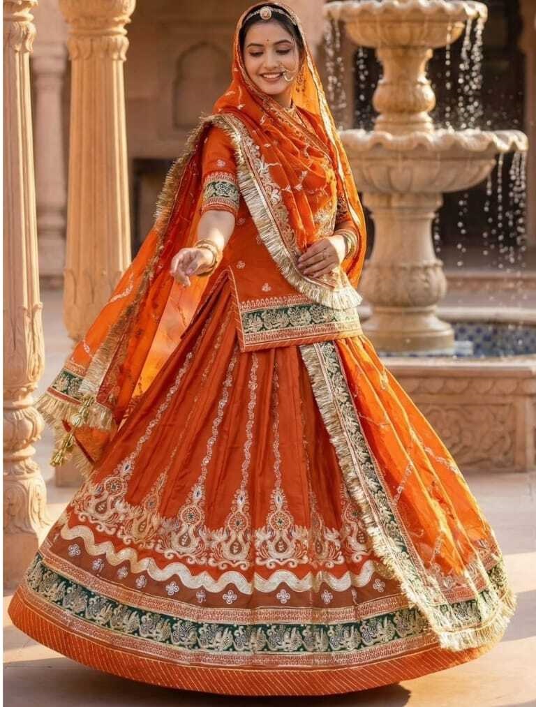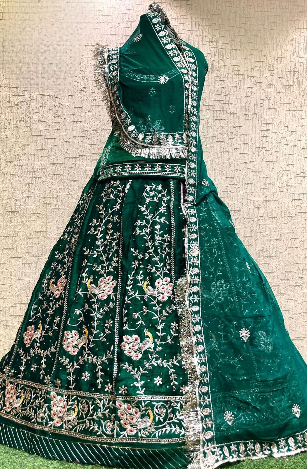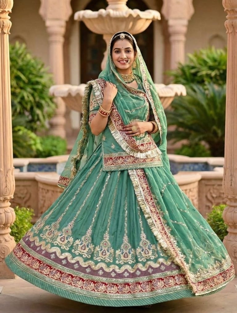 This poshak comes with a heavy odhni, beautifully adorned with a four-side border, detailed zaal embroidery, and gota turri finishing. The odhni drapes gracefully, giving the outfit a majestic look. The kurti is embellished with heavy gala (neck) work, ensuring that your upper attire is as ornate as the lehenga and odhni, creating a balanced and luxurious appearance.